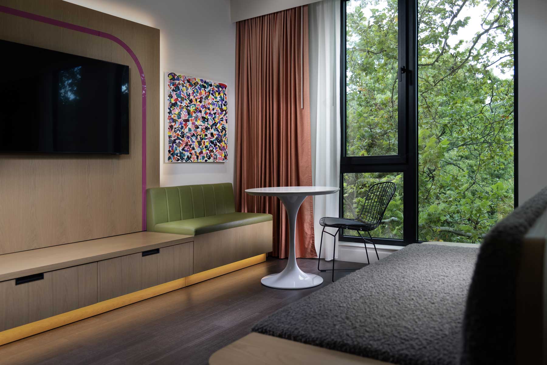 Wake up to views of the River Arts District through floor-to-ceiling windows that bathe your room in natural light and connect you with the vibrant energy of the surroundings. Whether you're sipping morning coffee or winding down in the evening, adjustable LED lighting helps you set the perfect mood. Step outside and explore — with one of the world's oldest rivers just beyond your door, you’re moments away from unforgettable outdoor adventures like hiking, biking, and paddling.